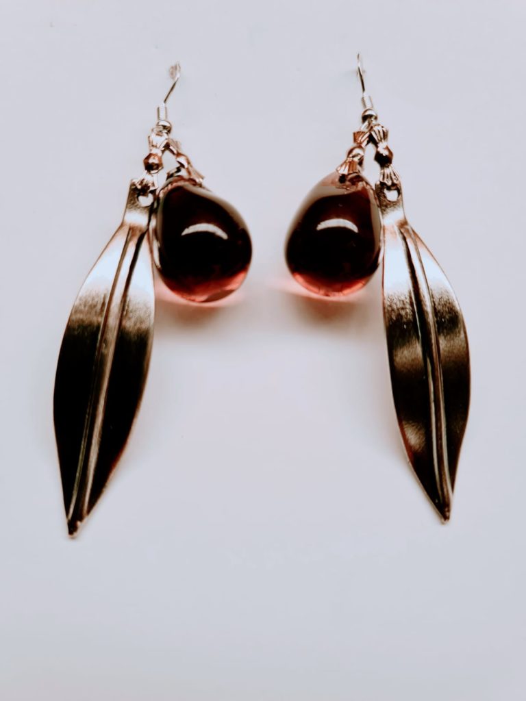Pendientes con aceituna de cristal y hoja decorada en plata vieja.