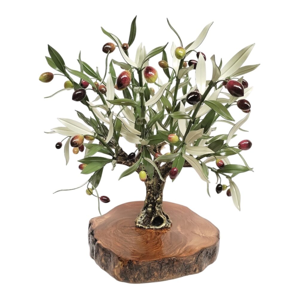 Nuestros trofeos de olivo están elaborados de forma totalmente artesanal en metal, cuidando cada detalle del diseño. Las ramas se forjan una a una, mientras que las aceitunas, de distintos tamaños, aportan realismo y equilibrio a la composición. El tronco, trabajado con textura y carácter, evoca la fuerza y la longevidad de los olivos centenarios que forman parte del paisaje de Andalucía.